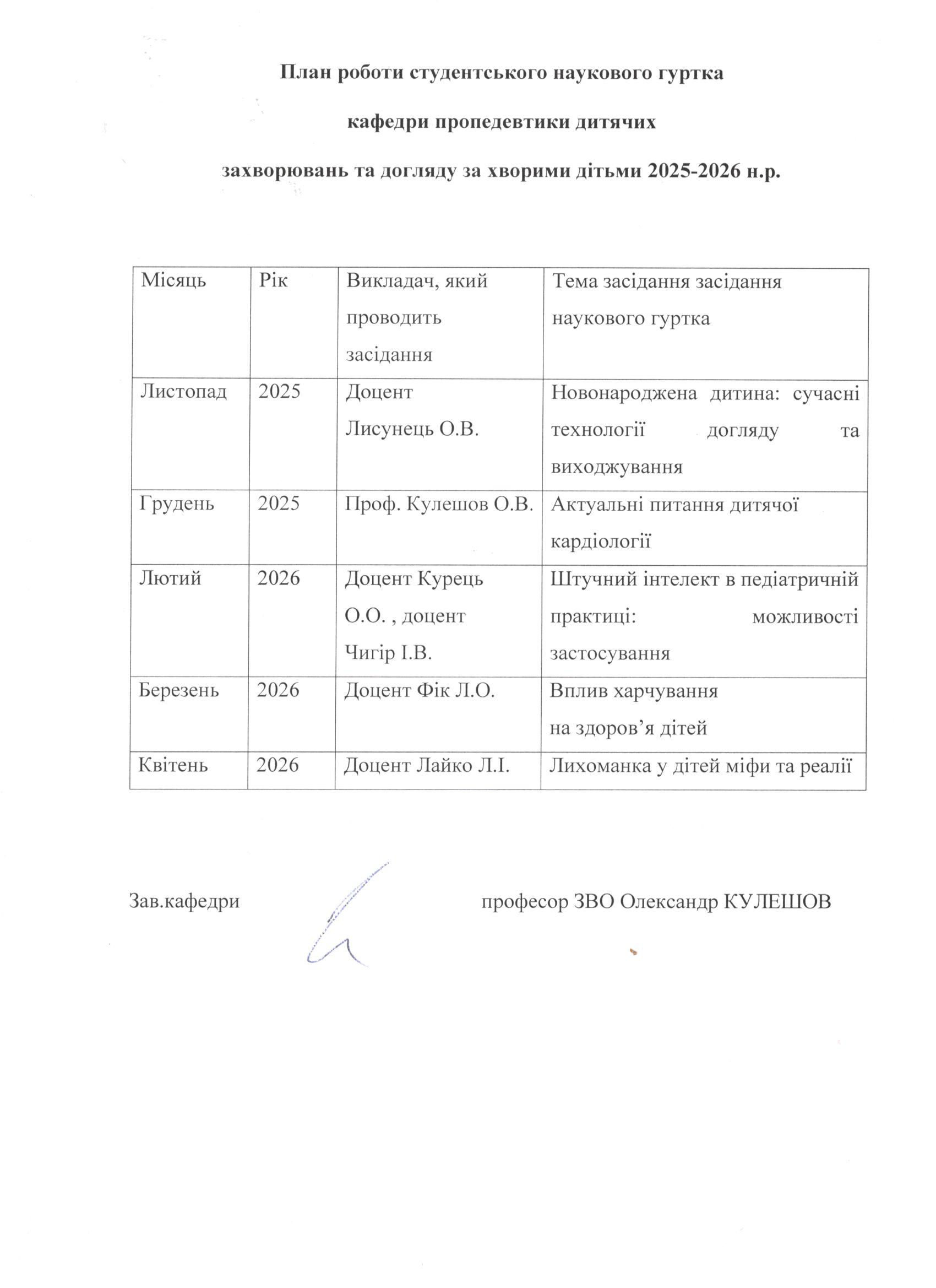 Перед початком кожного навчального року завідувачем кафедри професором О.В. Кулешовим та завучем кафедри доцентом Л.І. Лайко переглядаються робочі програми з навчальних дисциплін та, відповідно до змін програм і навчальних планів дисциплін, оновлюються тематичні плани лекції, практичних занять, самостійної аудиторної та позааудиторної роботи студентів, питання для теоретичного контролю знань та перелік практичних навичок для складання диференційного заліку.