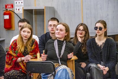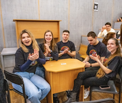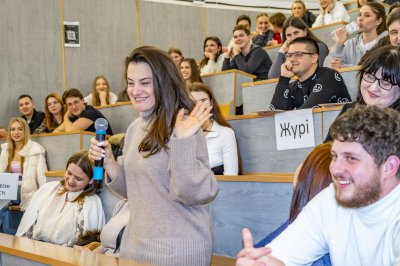 Справді сімейною та приязною атмосферу шоу зробили і повна зала вболівальників, і динамічний сценарій, і майстерність ведучих: студентки 4-го курсу Дарʼї Сурженко та асистента кафедри хірургічної стоматології та щелепно-лицевої хірургії Віталія Поліщука. Вони невимушено та енергійно тримали настрій свята, спілкуючись із командами та гостями, розповідаючи історії попередніх «Стоматологічних обрисів».