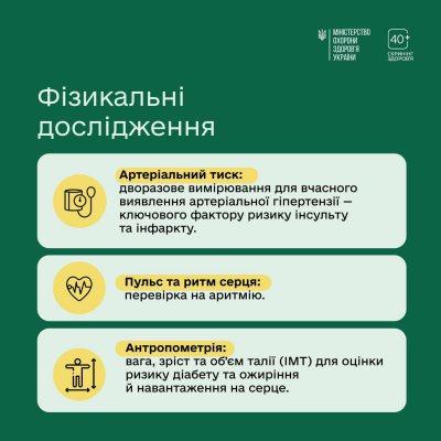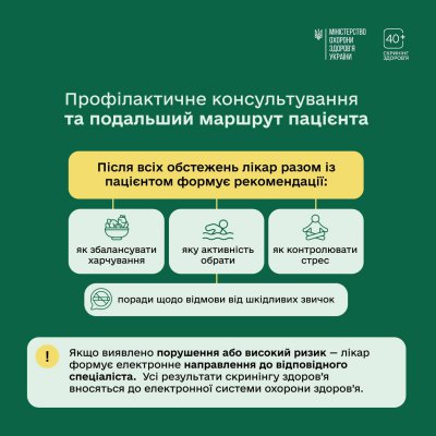 «Скринінг здоров’я 40+» — це національна ініціатива для українців та українок віком від 40 років. Програма передбачає раннє виявлення: