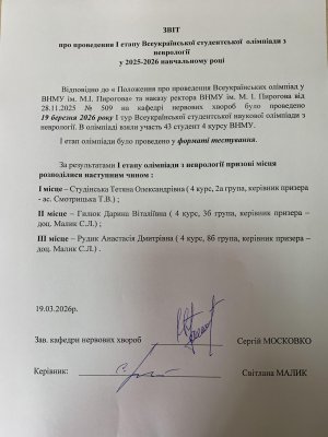 26.03.2025 1) О 16:00 - Студентська Олімпіада з неврології. Локація : Кафедра нервових хвороб, лабораторія №2 кафедри. З собою мати обов'язково : халат, змінне взуття.