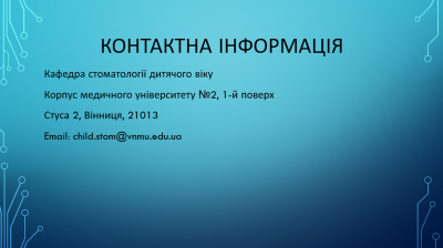 Доц. Касьяненко Д.М. – клінічна база кафедри стоматології дитячого віку стоматологічна клініка «ORTOVIN», вул. Замостянська 18В.
