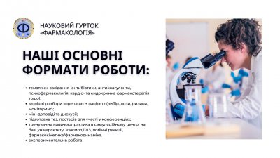 На кафедрі традиційно проводиться 1 тур олімпіади з фармакології. Кілька десятків студентів щорічно приймають участь у відбірковому турі, який проводить кафедра. Переможці відстоюють честь кафедри та університету на Всеукраїнській олімпіаді, де досить часто посідають призові місця (С. Лисенко, 1998; О. Смолінський, 1999; Д. Пестунов, 2000, Б. Кохан, 2017, В. Шоєтова, 2018, О. Кучерук, 2019).