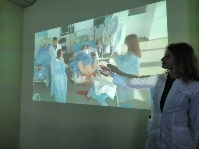 | Студентка акцентує увагу на діях своїх колег під час сценарію «Післяпологова кровотеча» |