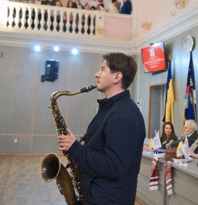 Завершив зустріч з успішними людьми Василя Князевича феєричний виступ грою на саксофоні студент третього курсу стоматологічного факультету Влад Бевз.