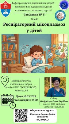 ü «Респіраторний мікоплазмоз у дітей. Клінічні кейси» — доцент Олена Онофрійчук.